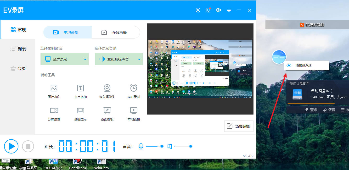 悬浮球的作用主要有可以直观看到,录制时间、开始录制、暂停录制这些常用的功能。