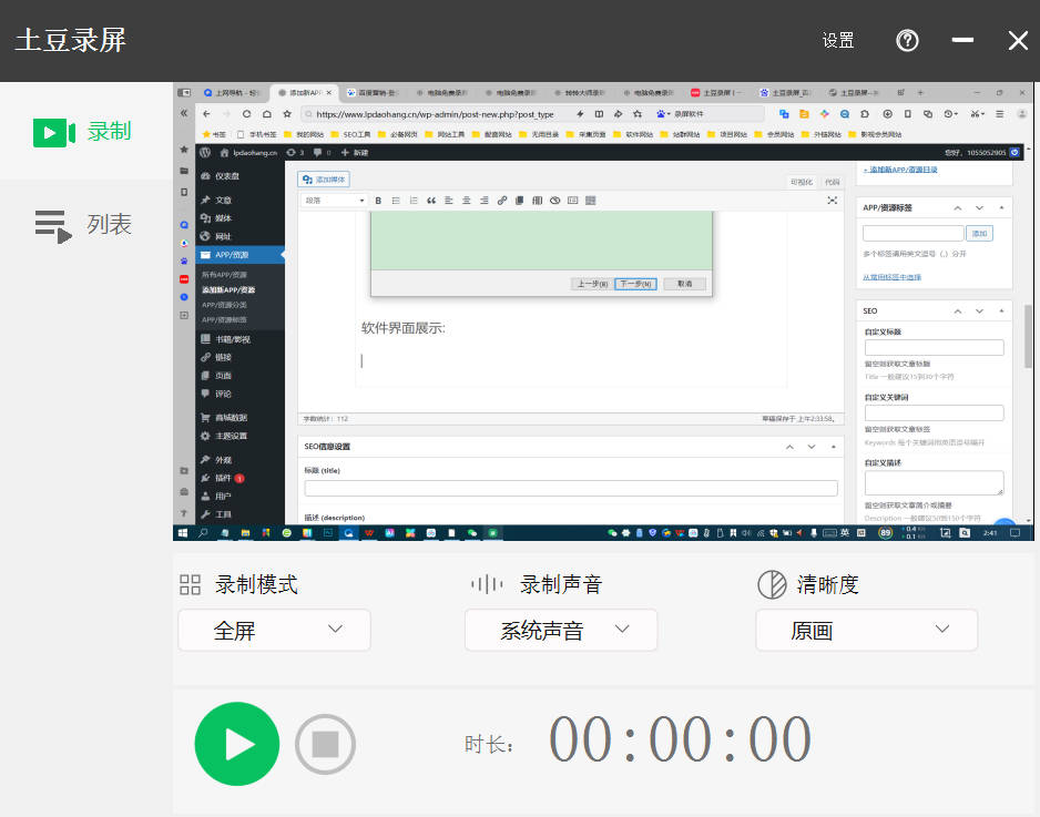 专业设置:可选择录制画质、自定义帧率、画质、音频码率、音频采样率等参数,支持分段保存。