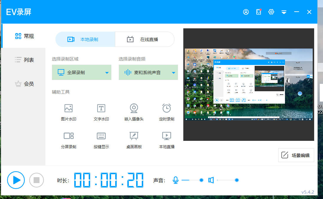 支持全屏录制、窗口录制、选区录制等多种录制方式。